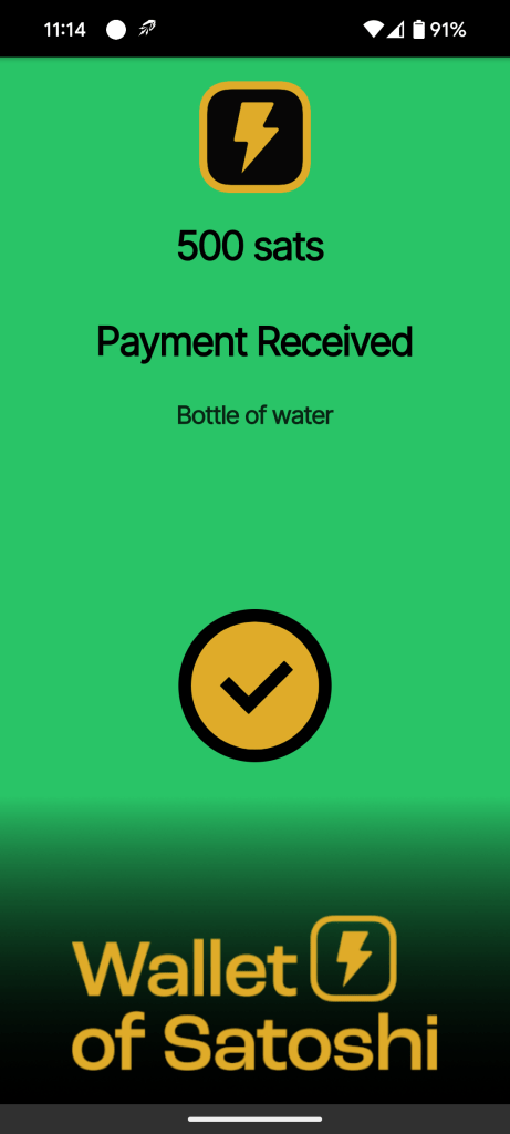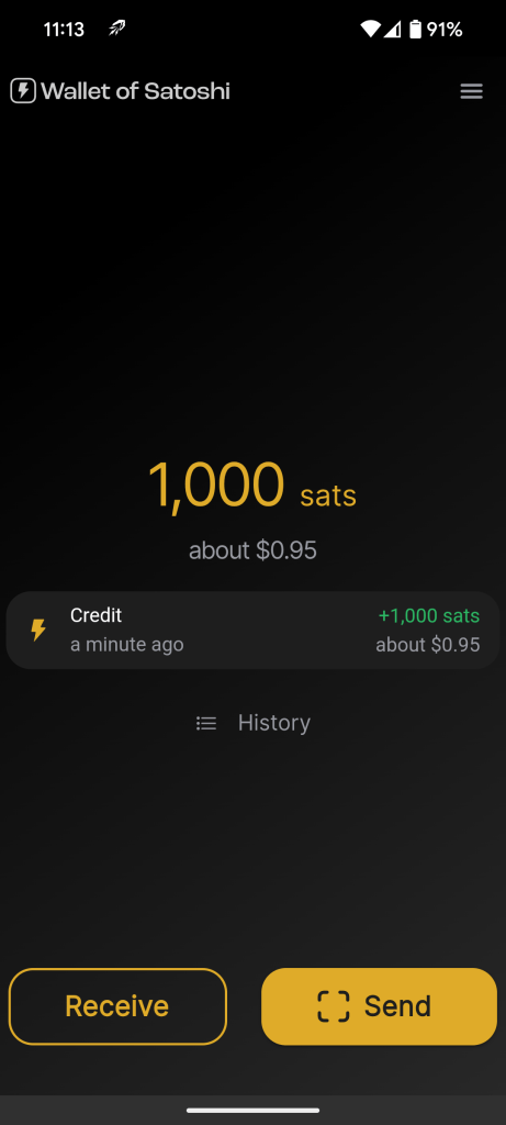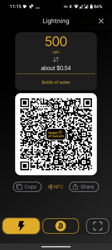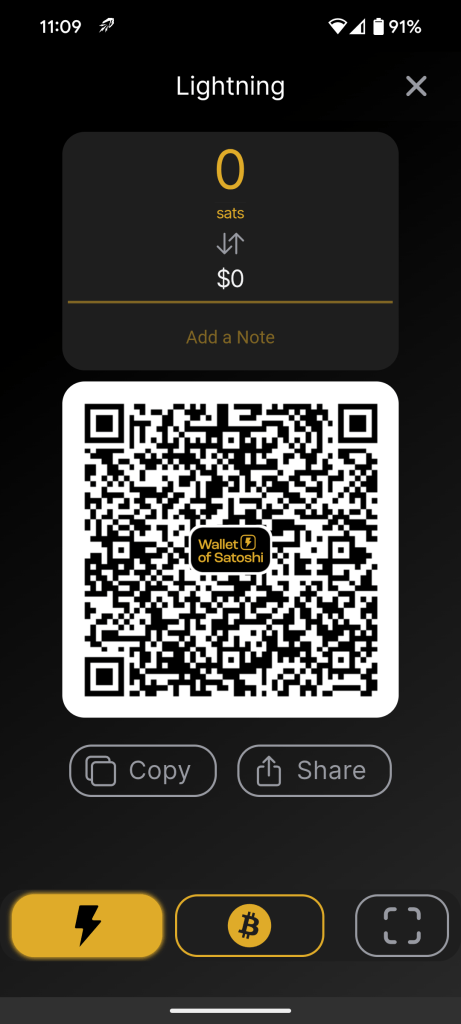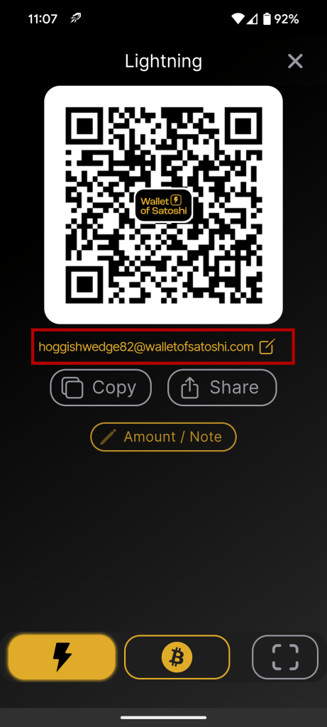 • Write down the address located below the QR code on the Receive screen (xxxxxx@walletofsatoshi.com)